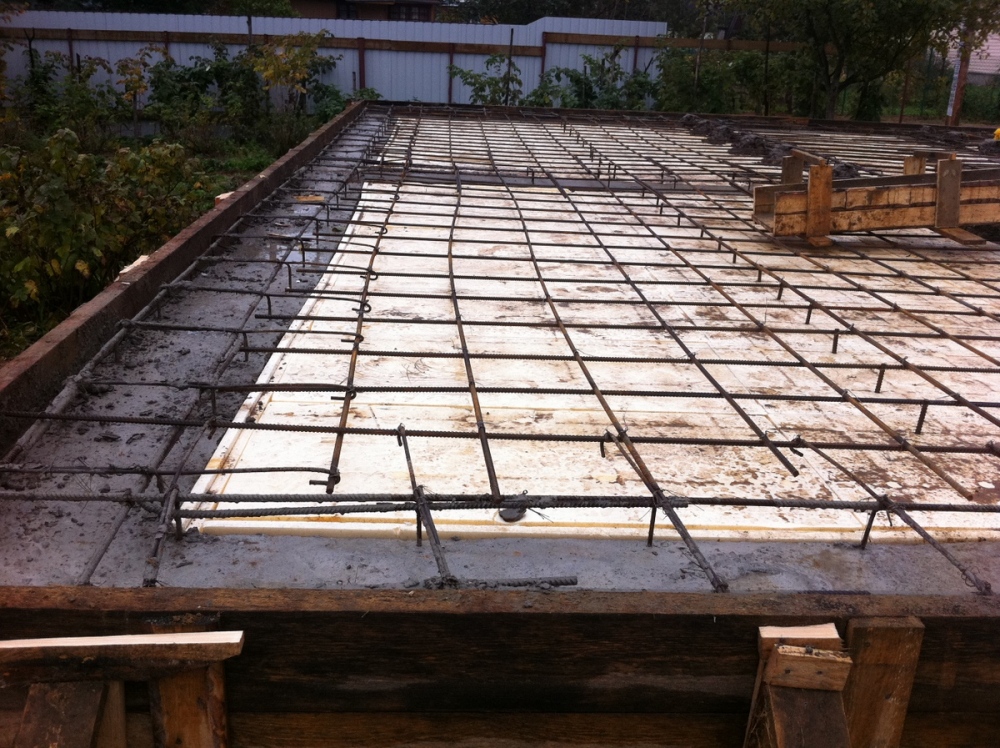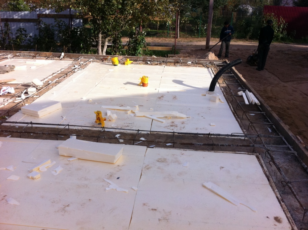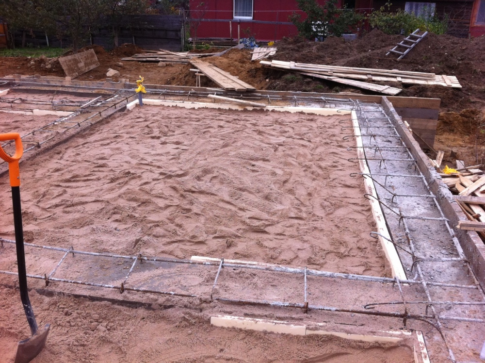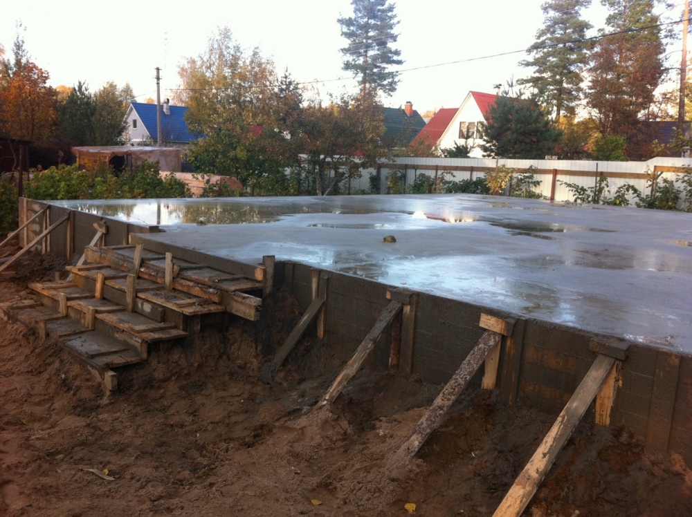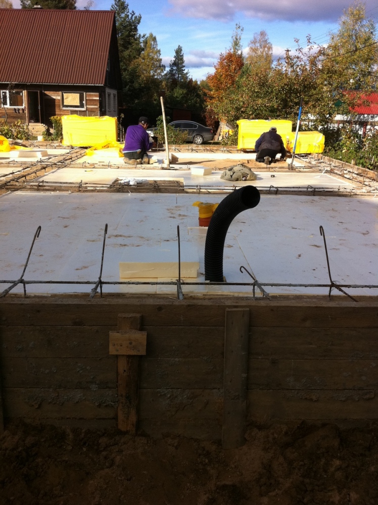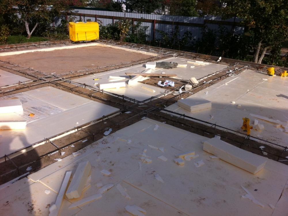 Теперь именно о ребрах "вниз", это предложение появилось из соображения, чтобы ребра не мешали в подвале. Но это, на самом деле, очень сложное в техническом смысле решение. Нужно включить плиту и ленту в работу с грунтом равномерно - так как задано в расчетах. Для того, чтобы надежно уплотнить грунт под плитой, лучше его укатывать и трамбовать до бетонирования ленты, при этом нужно ставить жесткую опалубку. Так же, вместо грунта вокруг ленты, частично или на всю ее высоту, лучше засыпать щебень, гравий или песчаные смеси не же ли грунт. Так как плиту закладывают выше глубины промерзания, а так же дополнительно утеплив ее снизу (мы использовали экструдированный пенополистирол 100 мм), нужно не забыть избавиться от пучинистых грунтов заранее предусмотрев и выполнив соответствующий дренаж и водоотведение. Нельзя забывать учитывать надежную гидроизоляцию в случае ребер вниз.