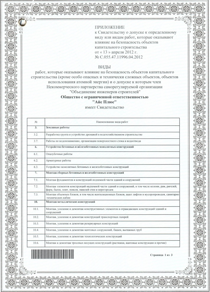 Свидетельство о допуске к определённому виду или видам работ, которые оказывают влияние на безопасность объектов капитального строительства ООО "Айс Плюс"
